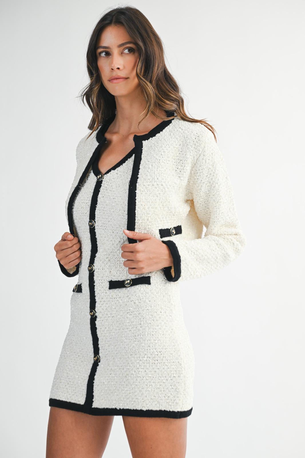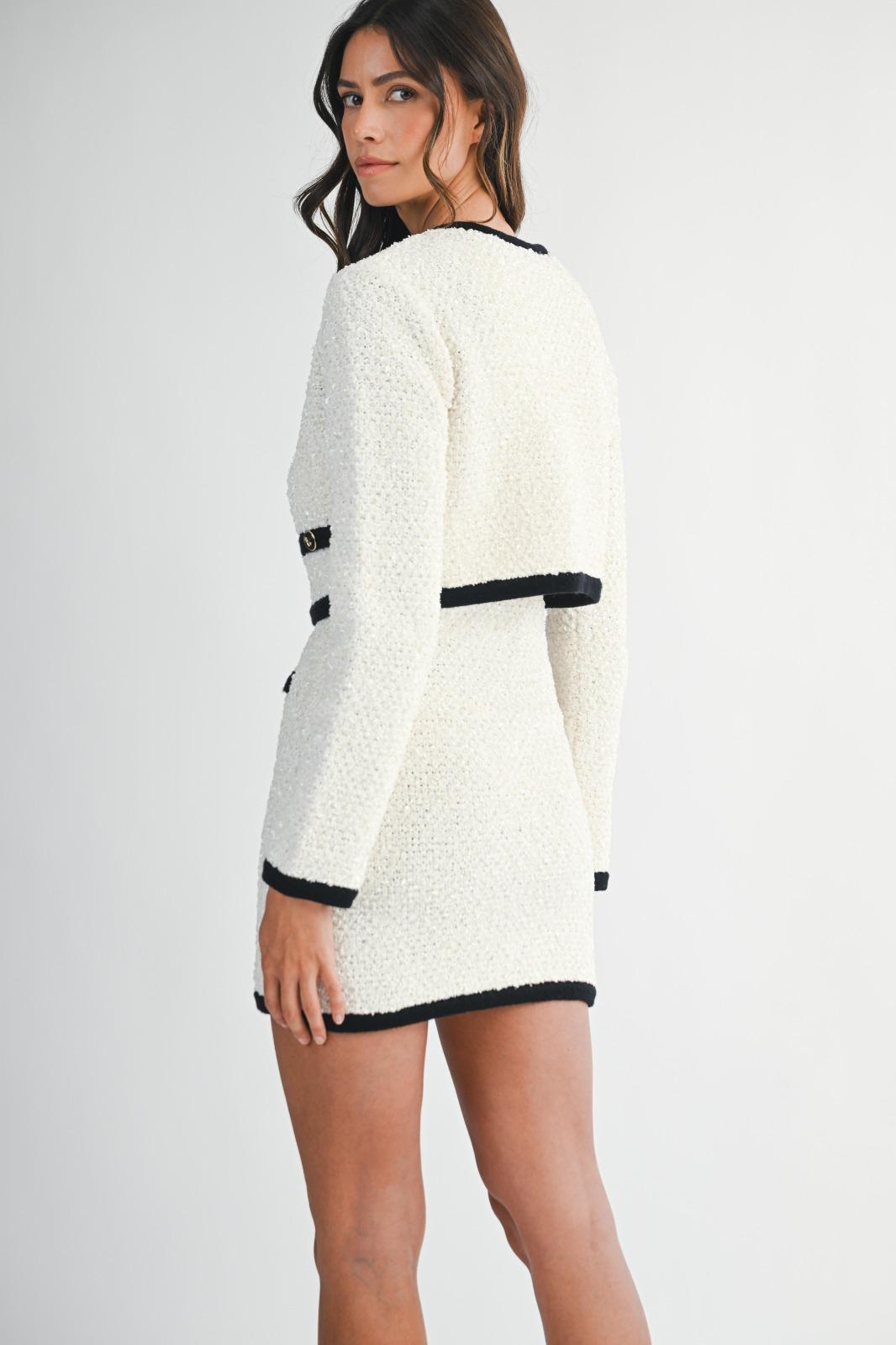 Meet the Château Elegance Ensemble a two-piece outfit crafted for the woman who loves classic beauty with a contemporary edge. The structured jacket adds a layer of polish, while the mini dress keeps it playful yet sophisticated. A wardrobe essential to transition effortlessly from meetings to soirées.