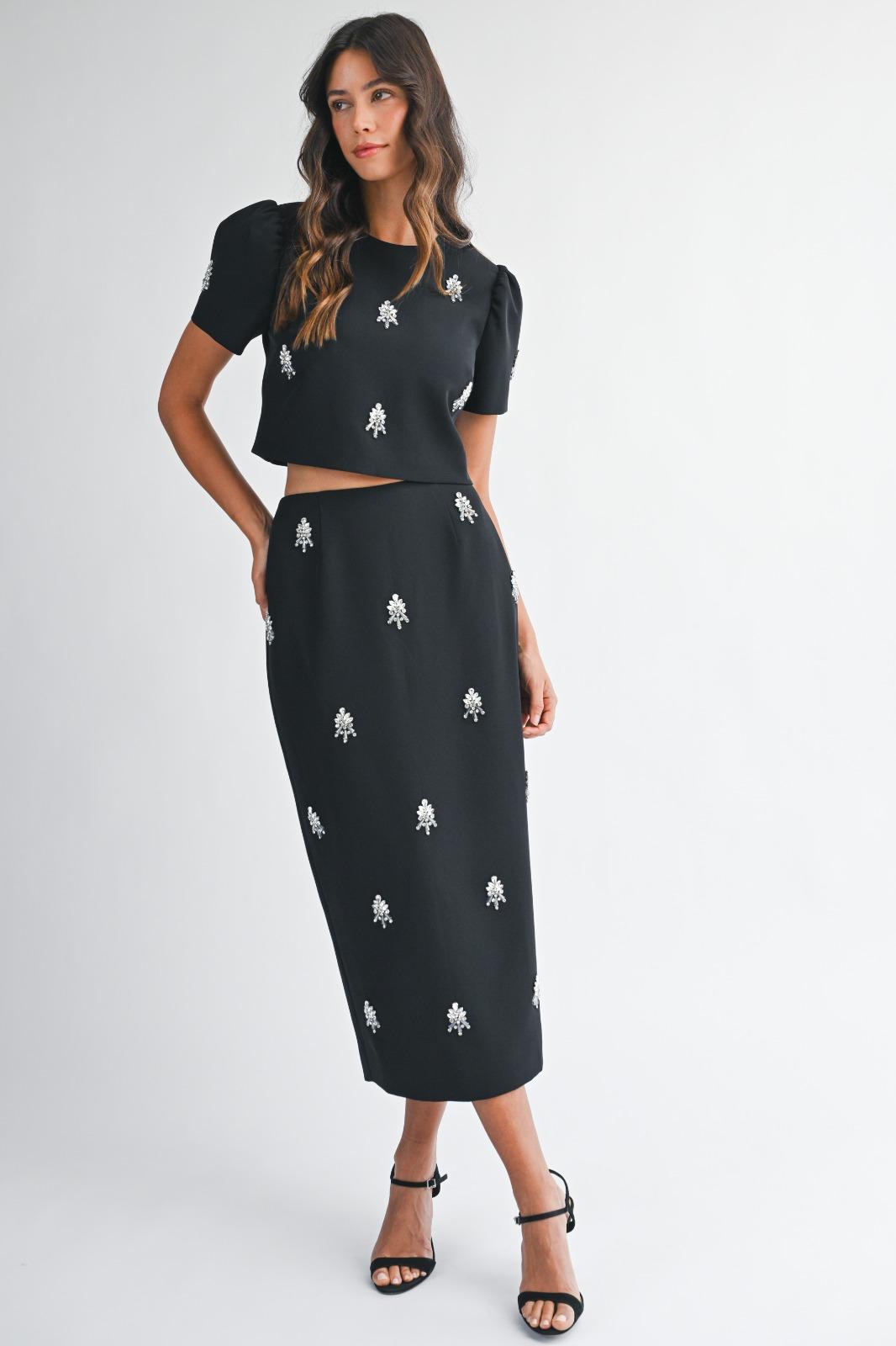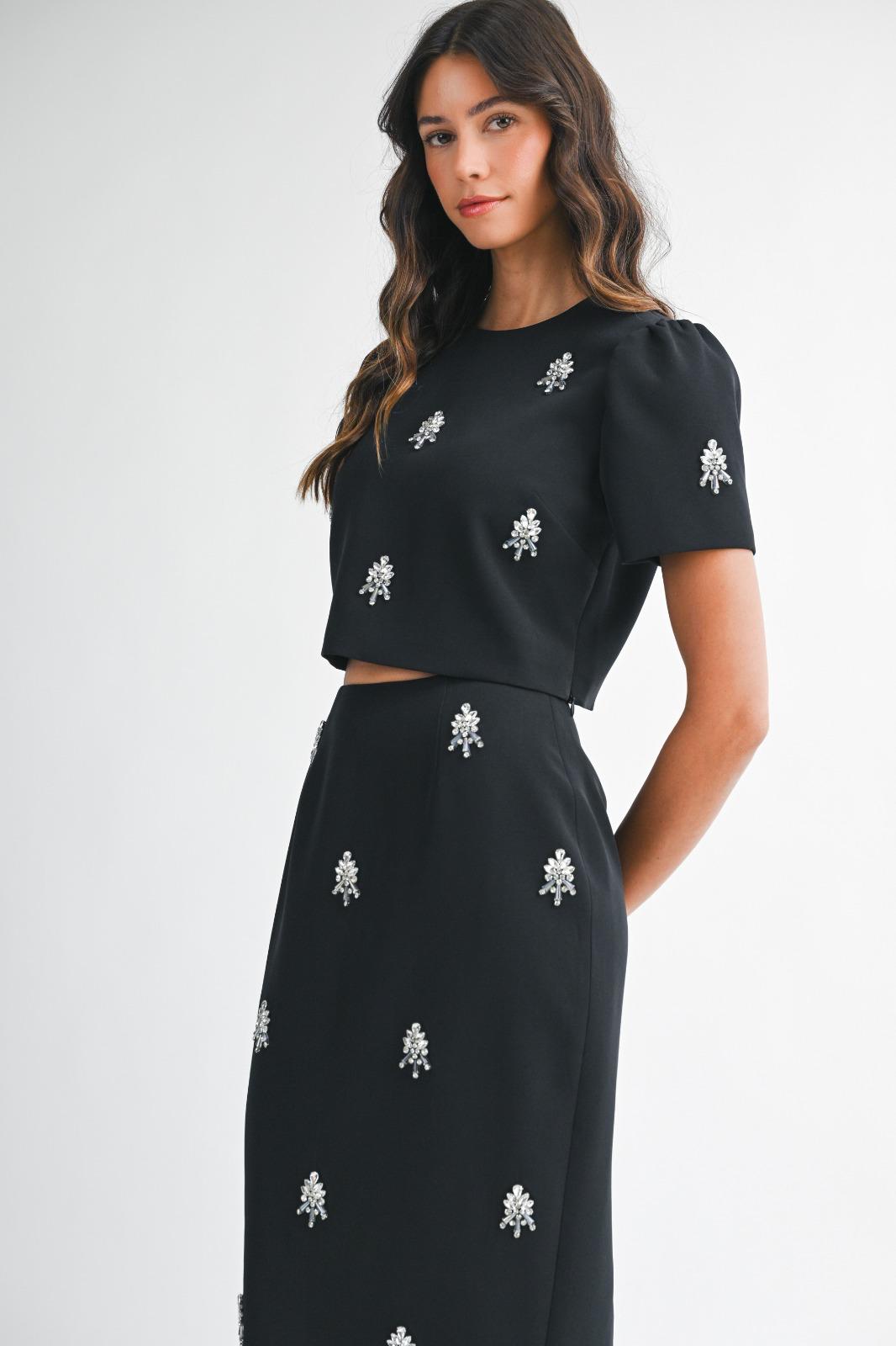 Elevate your style with this black embellished set featuring crystal appliqués that catch the light beautifully with every movement. The cropped top includes subtle puff sleeves and a clean, modern silhouette, paired with a sleek midi skirt that elongates the figure.