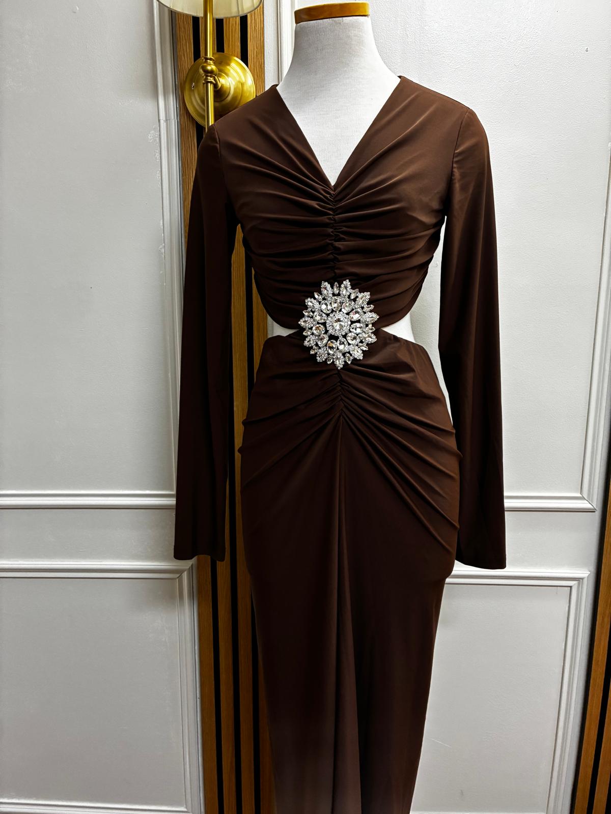 Sophisticated, sultry, and timeless The Cocoa Luxe Dress redefines evening elegance. Designed in a rich chocolate tone with a ruched silhouette that embraces every curve, its centerpiece crystal embellishment adds just the right touch of luxury. The side cut-outs and long sleeves create the perfect balance between daring and refined. Ideal for galas, formal dinners, or any event where you want all eyes on you.