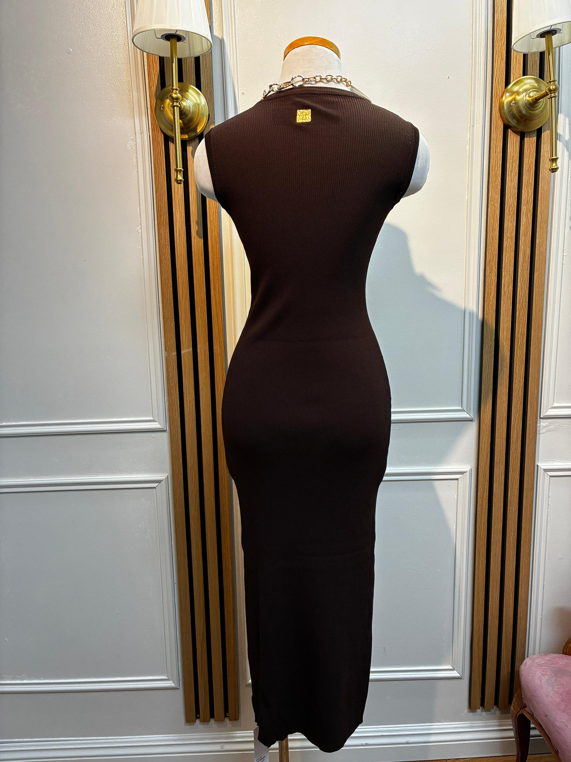Minimalist, elegant, and irresistibly modern, this fitted chocolate-brown midi dress is designed to highlight your natural silhouette. Crafted from a soft ribbed knit, it offers stretch and comfort while maintaining a sleek structure. The front slit adds subtle movement, and the golden keyhole detail brings a bold, luxurious touch.