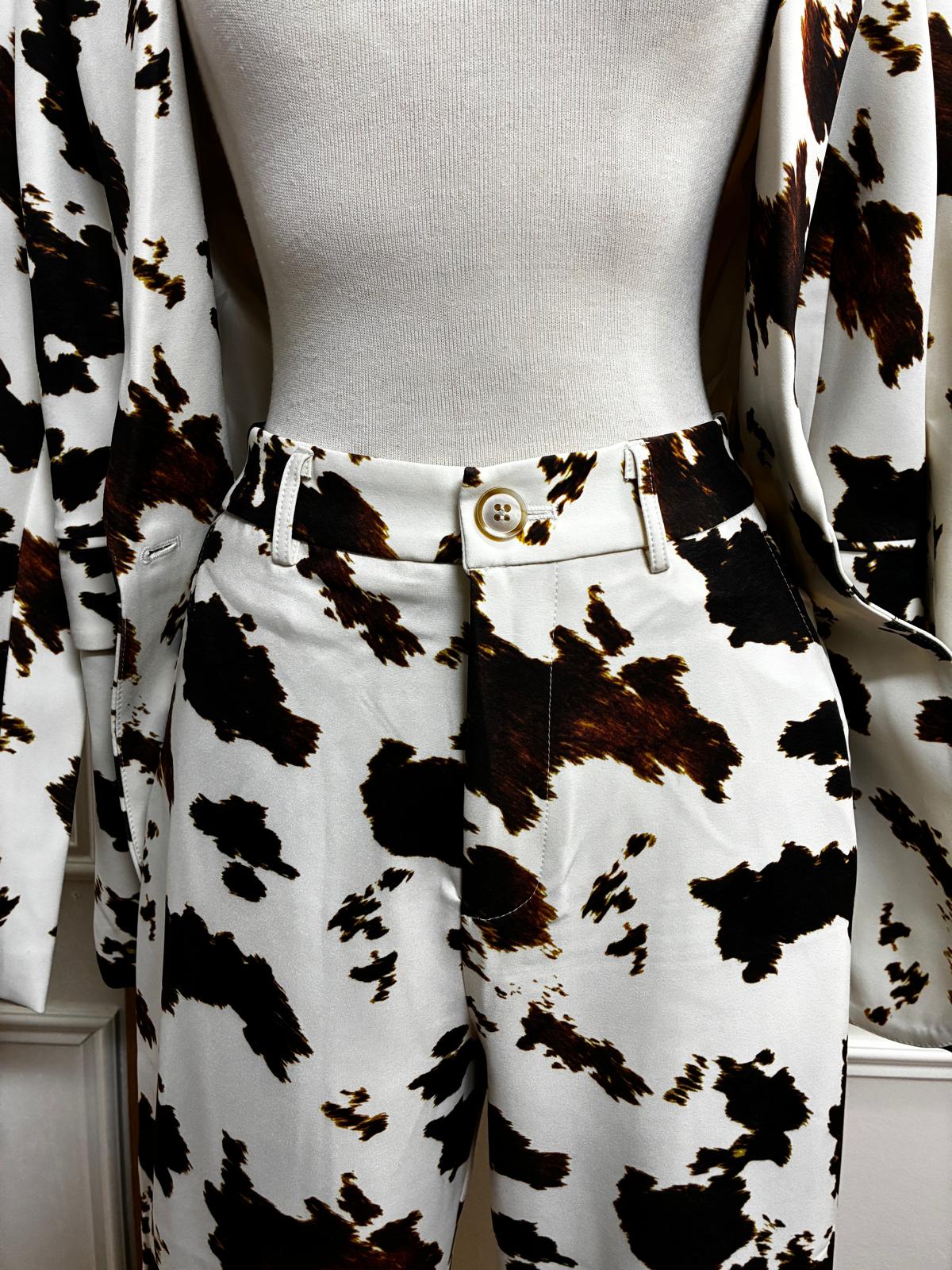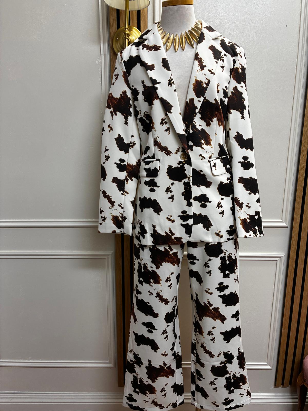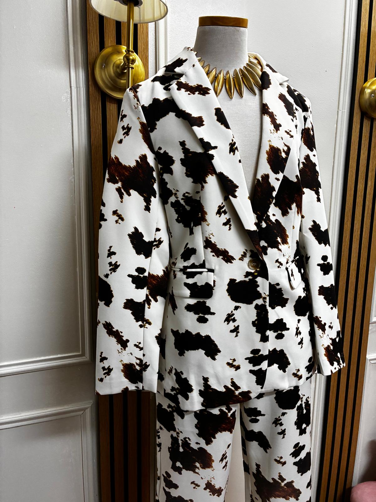 Make a bold fashion statement with The Wild West Set, a power suit that blends confidence and style with a playful edge. Featuring a tailored blazer and high-waisted wide-leg pants in a chic cow print, this outfit is perfect for turning heads at brunch, events, or a stylish night out. Designed for the fearless woman who knows how to own every room.